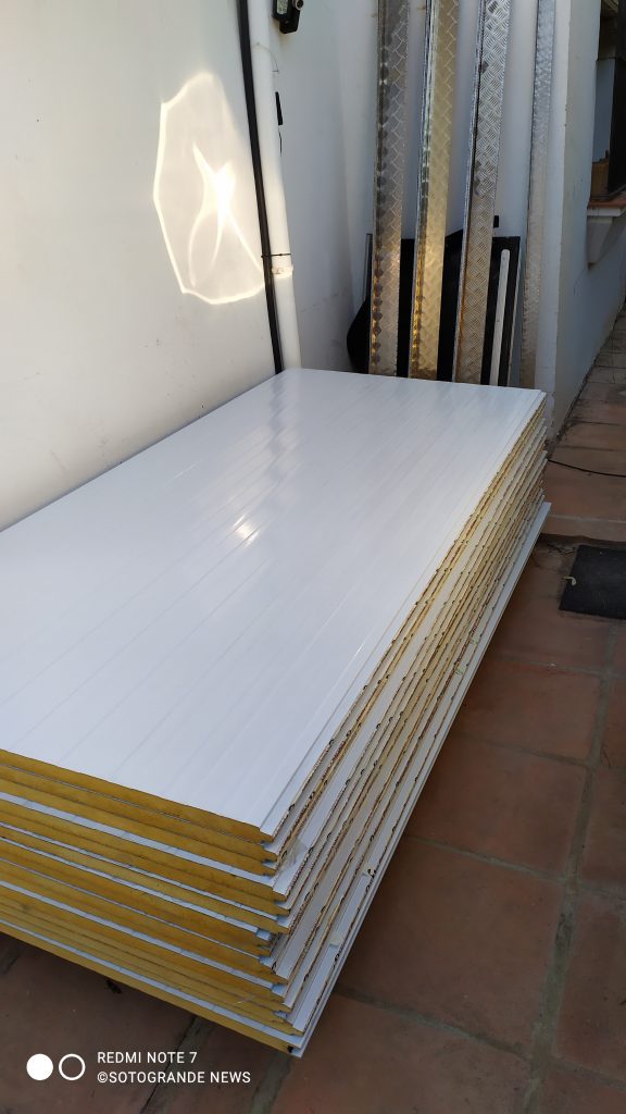 Die Sandwichplatten sind normale Fassadenplatten mit Nut und Feder haben eine Deckschicht von 0,6 mm Feinblech, verzinkt und lackiert und sind gesickt. Das Gewicht liegt bei 10,6 kg für die 30 mm Platte und 11,4 Kilogramm für die 50 mm Platte. Die 30 mm Seitenwände werde ich noch mit 20 mm XPS Schaum und 11 mm Profilbrettern verstärken, sodass ich auf eine Gesamtstärke von 61 mm komme.
